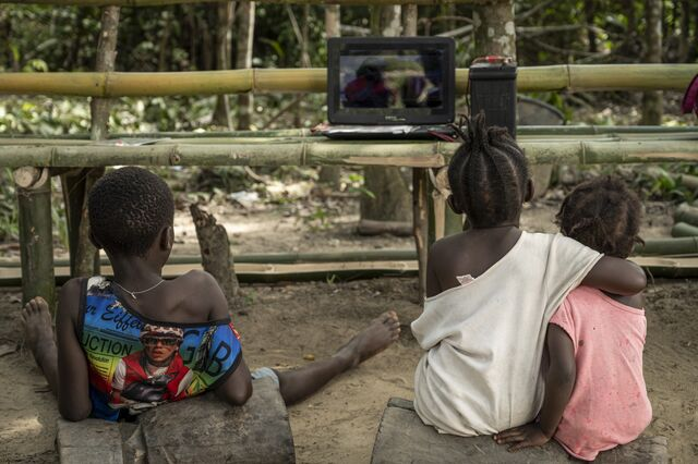 Kids watch a movie on a DVD player powered by a car battery in Jehjeh Town, which has no electricity or running water.