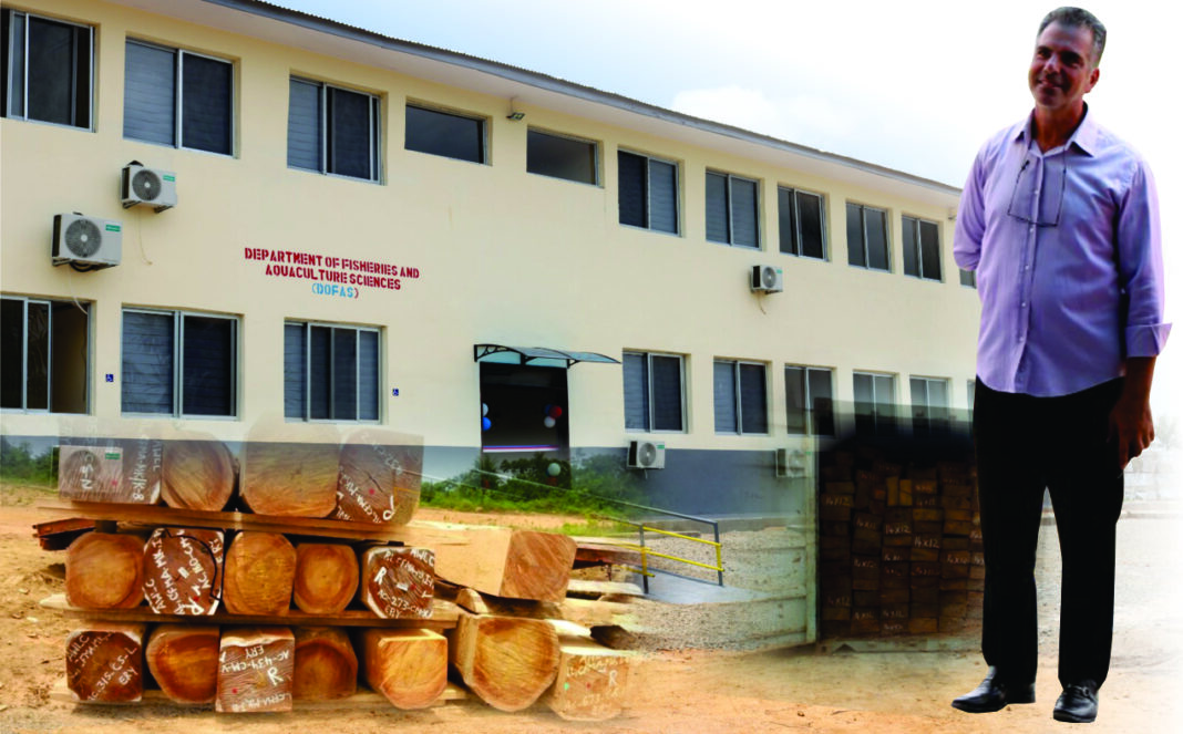 Top: A graphic depicting Lebanese businessperson Moussa Abdul Karim, the University of Liberia’s department of fisheries and aquaculture sciences and timber advertised, and timber blocks Karim advertises on his WhatsApp profile. Graphic by Rebazar Forte and pictures by Franklin Nehyalor