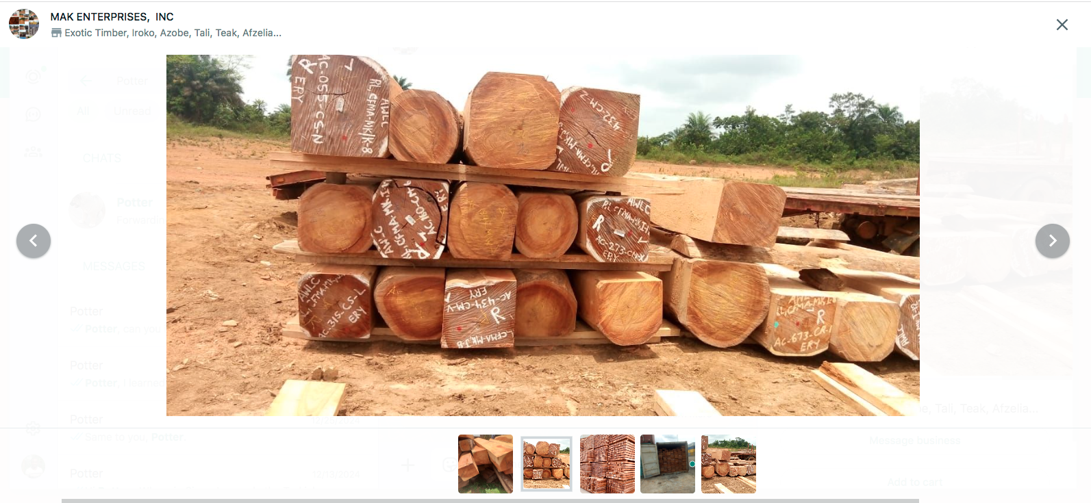 Though Mak Timber Group Liberia Inc. has exported at least once, this screenshot of Moussa Abdul Karim’s WhatsApp profile shows pictures of timber that he likely smuggled out of Liberia from Grand Bassa County