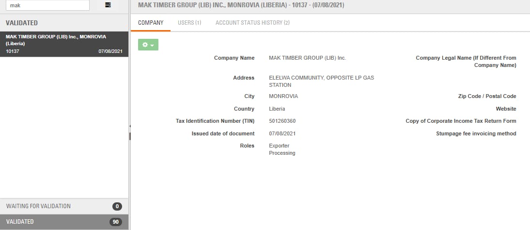 A screenshot of the FDA log-tracking system shows that Mak Timber Group Liberia Inc. shows that the company has never used the system to export timber, proof of his smuggling activities.