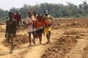 A relative of Prince Hali a mineworker who drowned in a mining pit left by illegal mining activities in Bella Yalla is helped from the scene after his body was recovered in January 2024 The DayLightJames Harding Giahyue