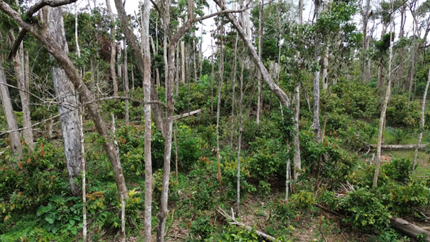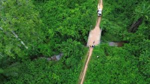 Top: A screengrab of a drone video showing a portion of a cocoa farm in Bargblor, Cavala District in Grand Gedeh County. The DayLight/Carlucci Cooper