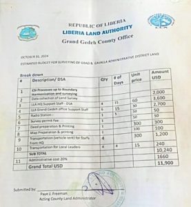 Togbasi and Paye Freeman, Grand Gedeh’s Acting Land Administrator, who approved the charge, said they were not authorized to speak on the matter. Kweshie Tetteh, the Land Authority’s communication director, who has that authorization, justified the charge in a Monrovia interview.